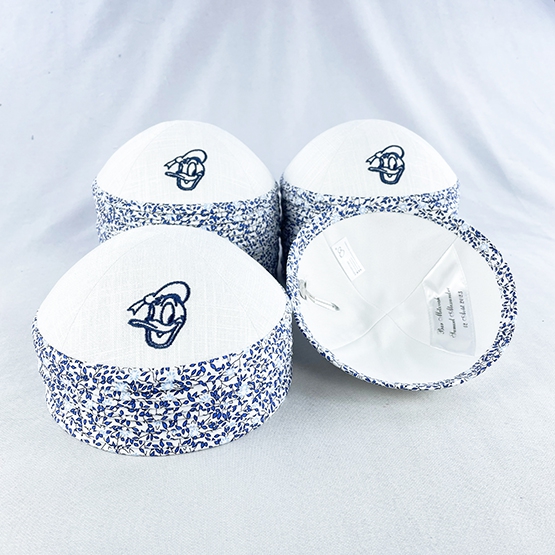 white linen kippa with navy embroidery and liberty border